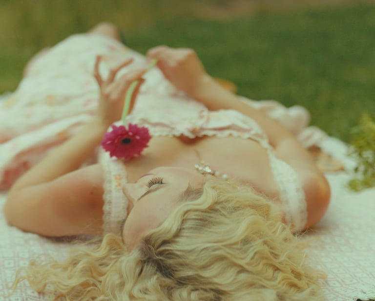 Day 1 of filming was centred around a cute asthetic summer time picnic all themed round Stella's signature colour pink. with her hair styled in tight mermaid waves and a pink cottagecore dress, the set was filmed in a park on the outskirts of Norwich Norfolk, Stella's home City and County. matched with a pink picnic blanket, wicker picnic basket, flowers, strewberry wine, and her guitar, Stella wanted to capture that old English picnic look with a touch of her own style. Stella even brought fresh fruit and a plate of freshly baked cakes to which one of them was a adorably taken by a passing by dog.